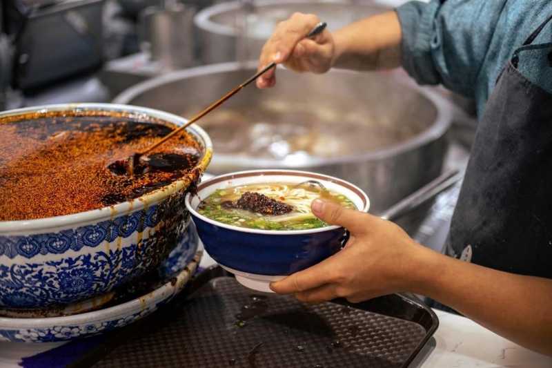 面汤清、萝卜白、辣子油红、蒜苗和香菜绿、面条微黄