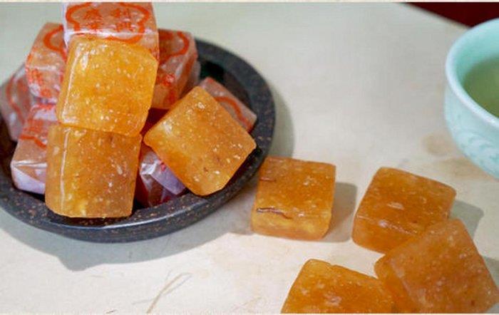 姜汁软糖是将生姜和糖精心熬制冷却而成,外皮柔软有弹性,内馅甜中带辣,可暖身。