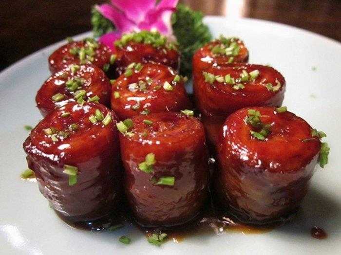 大肠经煮、炸、烧等多道工序,色泽红亮,口感软糯,酸甜苦辣咸五味俱全。