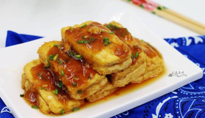 豆腐裹蛋液煎至金黄,再加高汤煨制,外酥里嫩,汤汁鲜美。