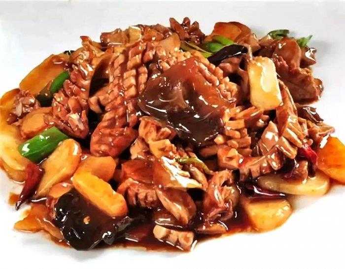 猪肚尖和鸡胗快速爆炒,口感脆嫩,咸鲜适口。