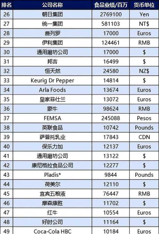 惊喜来自中国,伊利业绩突破180亿美元,跃居第十八位,有机奶和益生菌饮料成新增长点,蒙牛和娃哈哈也稳步提升。