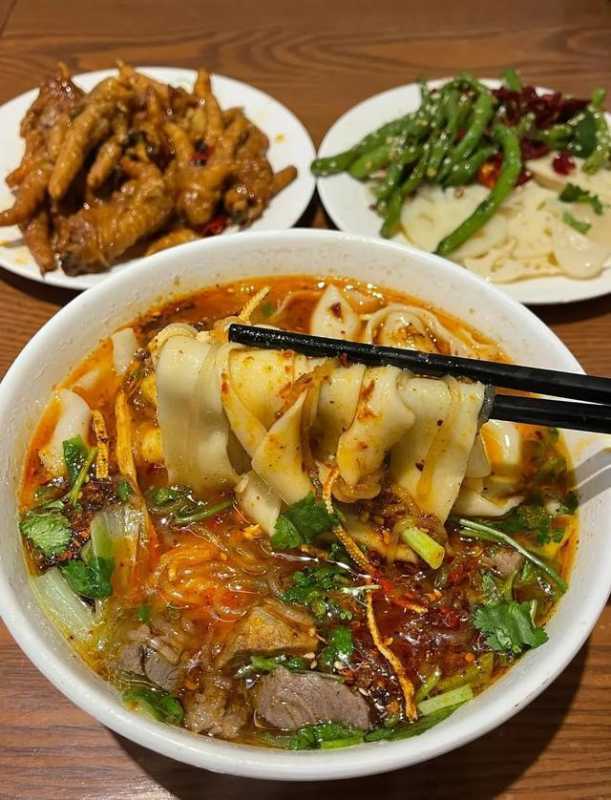 那汤清澈见底,是牛骨和牛肉熬出来的精华,喝一口就知道不简单。面条拉得均匀顺滑,配上雪白的萝卜片、火红的辣椒油、翠绿的香菜和蒜苗,那叫一个色香味俱全!最绝的是,你想吃细的还是粗的,师傅都能一拉就来,筋道得很。