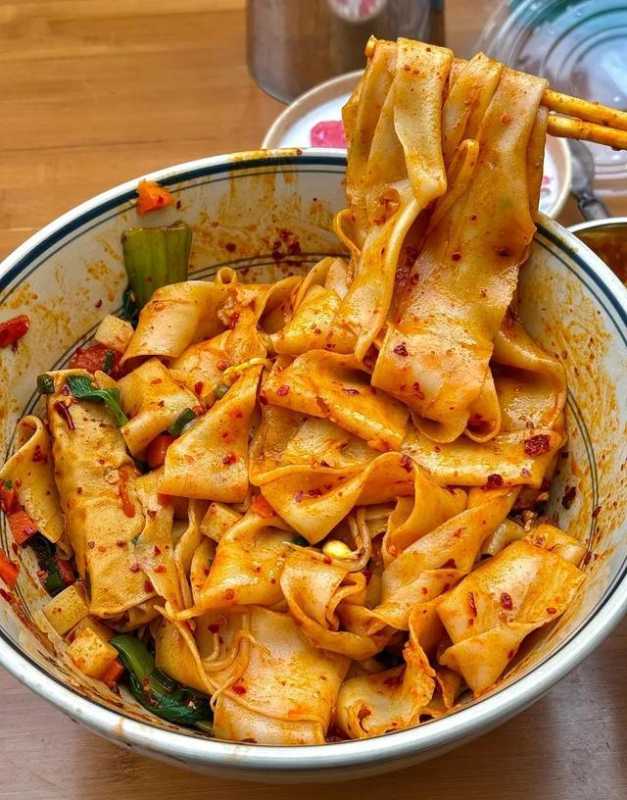 这面条宽厚有嚼劲,上面铺满了葱花、蒜末、辣椒面等配料,热油一浇,顿时香气四溢。吃的时候把面条拌匀,每一根都裹着红亮的油汁,香辣可口,越嚼越有味。陕西人管这叫"一啪香",确实名不虚传!