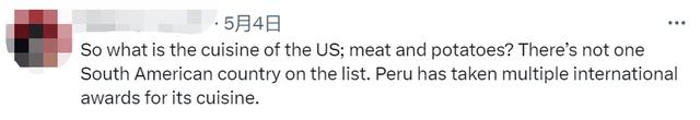 所以美国美食到底是啥,肉和土豆吗?榜单上竟没有一个南美国家。秘鲁可是拿过很多国际性的美食奖项啊。