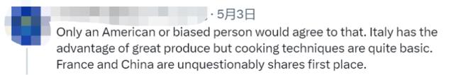只有美国人或者带着偏见的人才会认同这些。意大利菜做出来很好吃,确实是其长处,但烹饪技巧其实相当基础。法国和中国才是当之无愧的第一。
