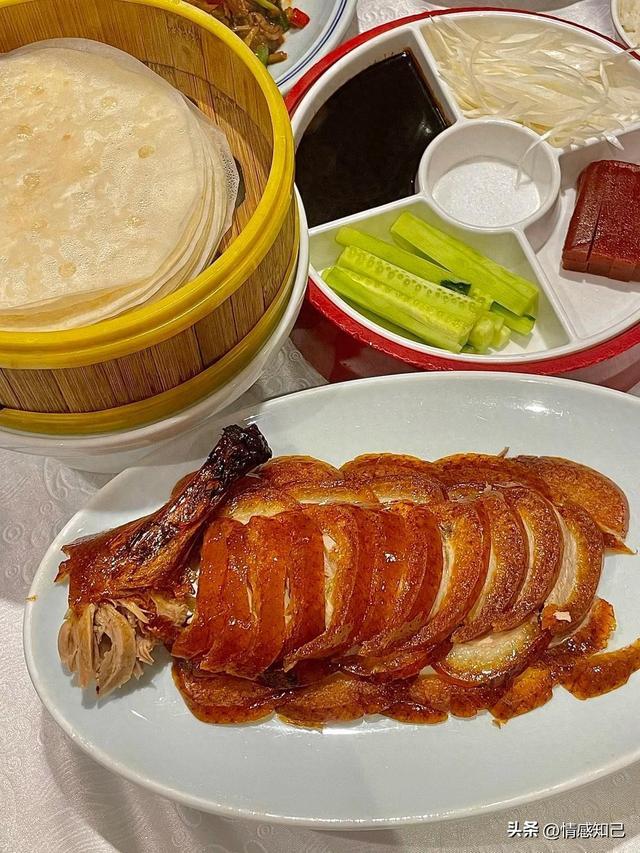 特色: 外皮酥脆如纸,肉质细嫩多汁。用荷叶饼卷上鸭肉、甜面酱、黄瓜条、葱丝,一口下去,口感层次极其丰富。