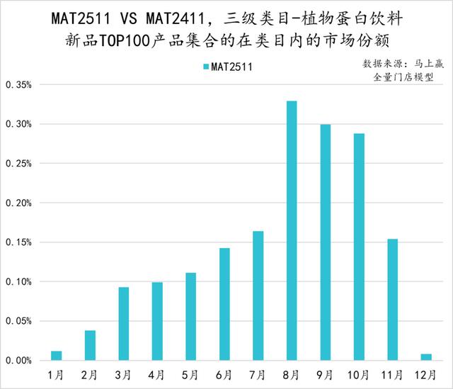 相比MAT2411,MAT2511植物蛋白饮料在TOP100新品中取得了0的突破。由于两款新品上市时间分别为2024年12月和2025年7月,因此在8月产品集合迎来了市场份额峰值,但整体市场份额依然较低不足0.35%,且在随后的9-11月呈现明显的下滑。