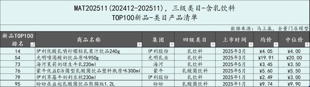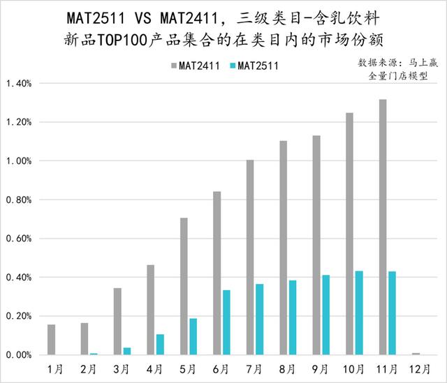 从含乳饮料类目中TOP100新品的市场表现来看,相比MAT2411,MAT2511时间段的新品在类目内的成长明显更差,在大多数月份,MAT2511的TOP100新品的市场份额不足MAT2411的三分之一,或可说明过去一年,类目新品表现、成长性相比之前更差。