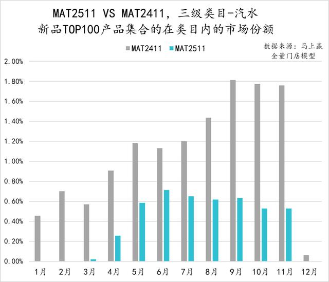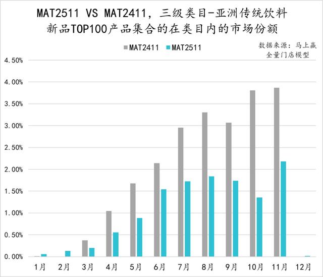 从亚洲传统饮料类目中,TOP100新品的市场表现来看,MAT2511的TOP新品集合的市场份额表现明显弱于MAT2411的TOP新品表现,除11月外其他月份均未超过2%。