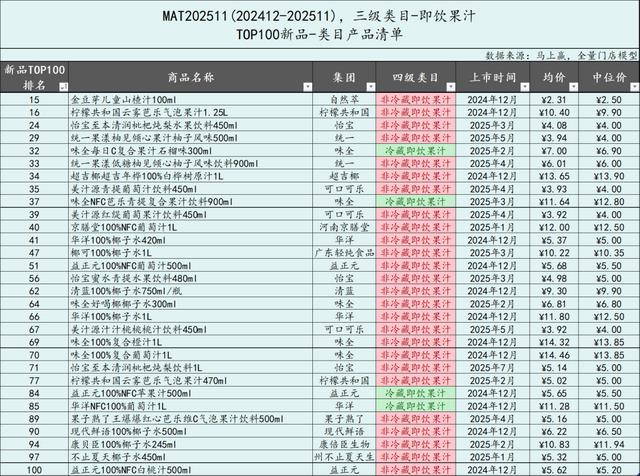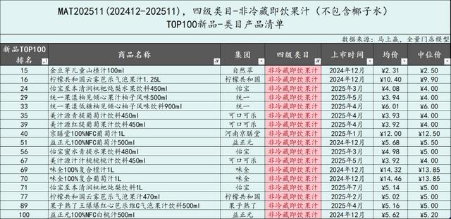 非冷藏即饮果汁、有糖即饮茶、植物饮料和即饮咖啡类目的TOP100上榜新品数量明显增加。非冷藏即饮果汁类目在MAT2511的TOP100上榜新品数量高达26款,比去年的13款高出一倍。有糖即饮茶的TOP100新品数量从7款跃升到12款,成为今年新品TOP100上榜数量TOP3的类目。植物饮料类目、即饮咖啡类目进入TOP100的新品数量均为8,但相比去年均有翻倍以上的数量增长。