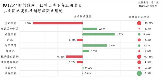 首先来看各三级类目在MAT2511、MAT2411两个时间段的占比,含乳饮料是饮料大类中唯一占比超过20%的类目,即饮茶和奶茶、功能饮料、汽水、即饮果汁和包装水的占比均超10%,植物蛋白饮料占比约8%、亚洲传统饮料(凉茶、酸梅汤、植物饮料等)占比约4.5%,即饮咖啡占比约1.5%,米露饮料占比不足0.1%。