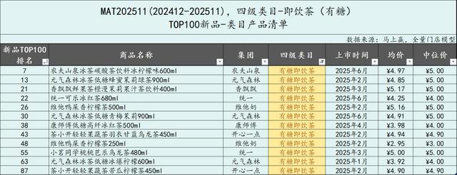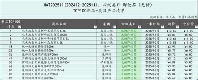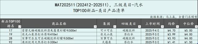 TOP100选取方式:将所有在时间周期内上市的SKU,以其在饮料大类中的销售额市占率进行降序排列,取前100个SKU,限制条件为不含自有品牌产品、不含组合装(内装数>1的套组、箱、礼盒等),数据模型为马上赢全量门店模型。