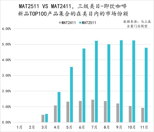 从即饮咖啡类目中,TOP100新品的市场表现来看,相比MAT2411,MAT2511的表现明显更好,新品集合自4月起市场份额就超过了MAT2411新品的表现。同时,类目中的TOP新品集合在2025年11月已经占据了5%左右的市场份额,新品成长性表现较好。