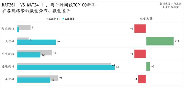 从MAT2511、MAT2411两个时间段TOP100新品在各四级类目中的分布数量和两个时间段的差异来看: