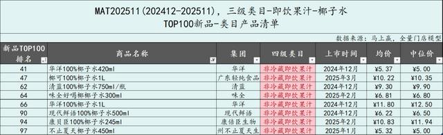 在即饮果汁类目中,椰子水类型产品也在今年的TOP新品中占据了相当大的比例,共有8款产品在MAT2511进入到TOP新品中。产品类型都是100%椰子水产品,来自7个不同的集团,规格245ml到1L均有覆盖。