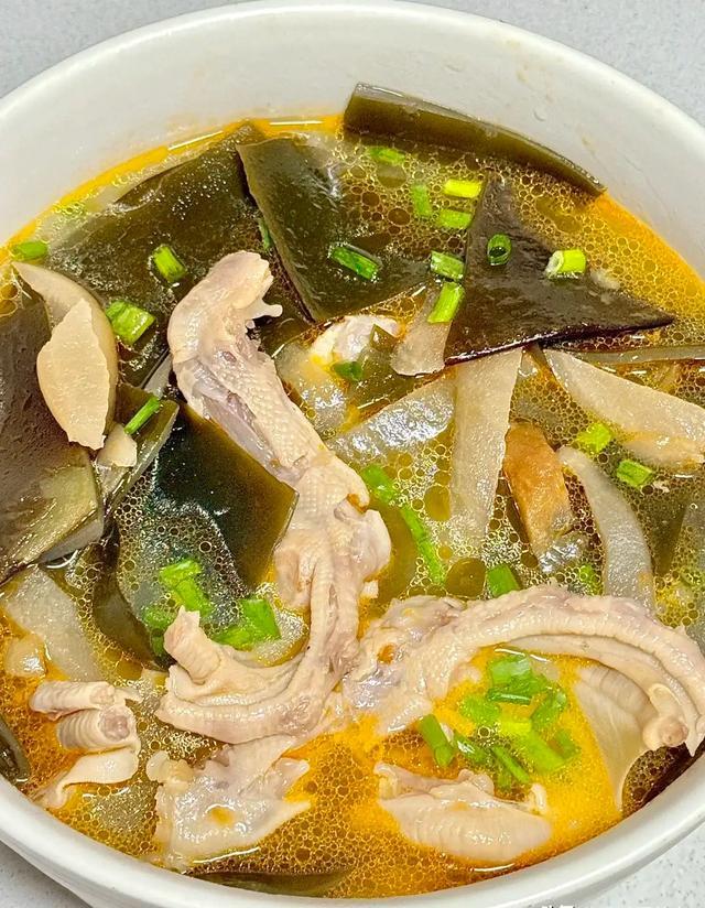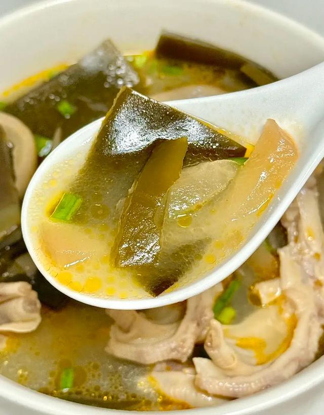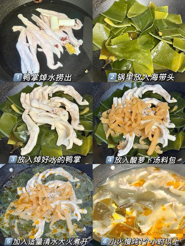 海带含碘丰富,对维持身体正常代谢很重要,还含有可溶性纤维。和开胃的酸萝卜、胶质丰富的鸭掌一起炖汤,滋味醇厚,营养互补。