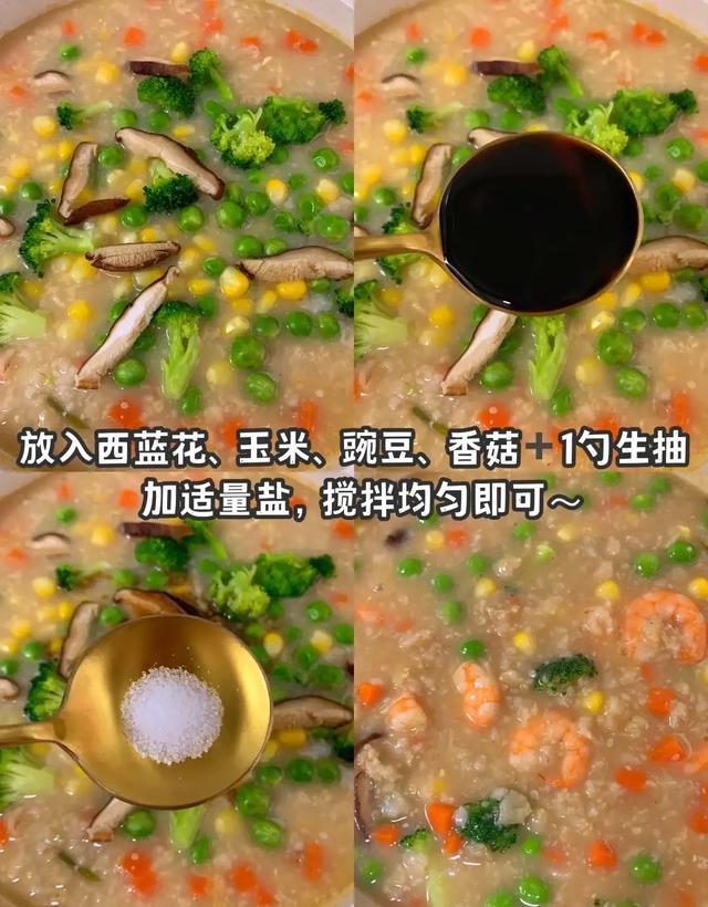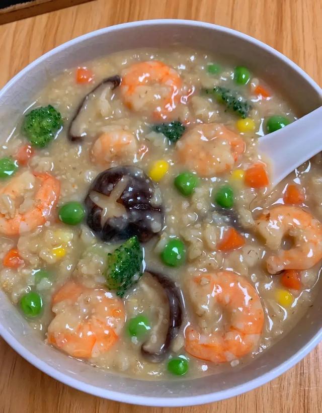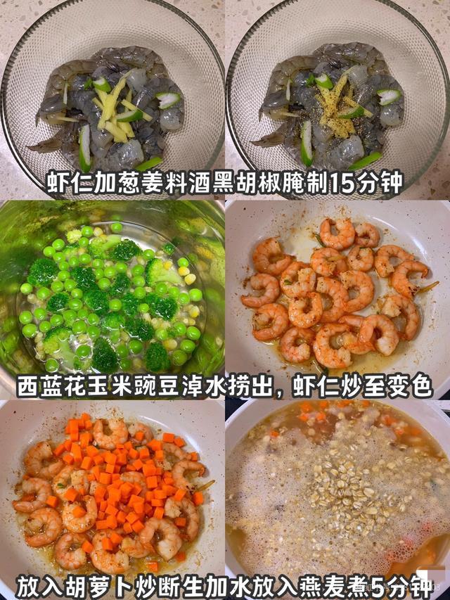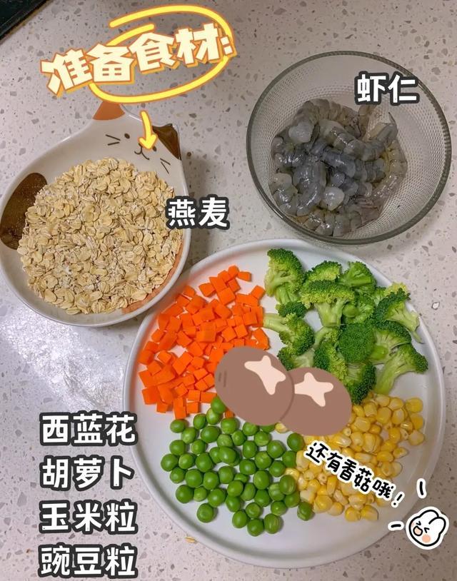 1. 即食燕麦片半碗。鲜虾剥成虾仁,用料酒和白胡椒粉腌一下。准备一些时蔬,如玉米粒、青豆、胡萝卜丁,焯水备用。