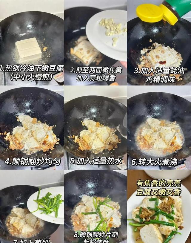 放入豆腐片,中小火慢慢煎,煎到一面金黄后翻面,把另一面也煎得金黄酥脆,然后放入蒜片和小米辣爆香。倒入调好的料汁,转大火快速收汁,让每块豆腐都裹上浓郁的料汁,汤汁收浓后就能出锅!外焦里嫩,配米饭能多吃两碗!