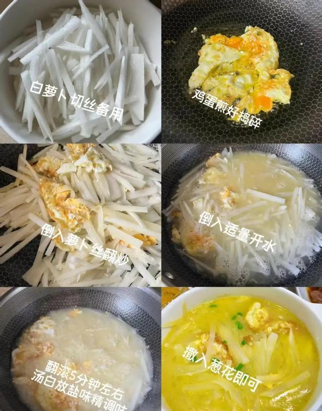 有人觉得萝卜汤煮不白?是你没煎鸡蛋!准备1根白萝卜、3个鸡蛋,再来点葱花香菜。白萝卜去皮切成均匀的细丝,切得越细越容易煮软出味;鸡蛋打入碗中加少许盐搅散。