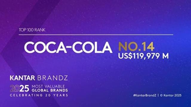 【2025年6月,上海】近日,2025凯度BrandZ“最具价值全球品牌”100强榜单发布,【可口可乐】蝉联食品饮料品类榜首,其整体排名位居第14位,较去年上升一位,品牌价值达1199.79亿美元。