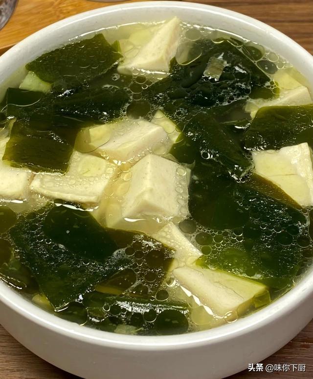 做法:干海带结泡发洗净,豆腐切小块;锅中加清水,放入姜片、葱段烧开,下海带结煮15分钟,再放入豆腐块小火炖10分钟;加生抽、盐、白胡椒粉调味,撒少许葱花提香即可。