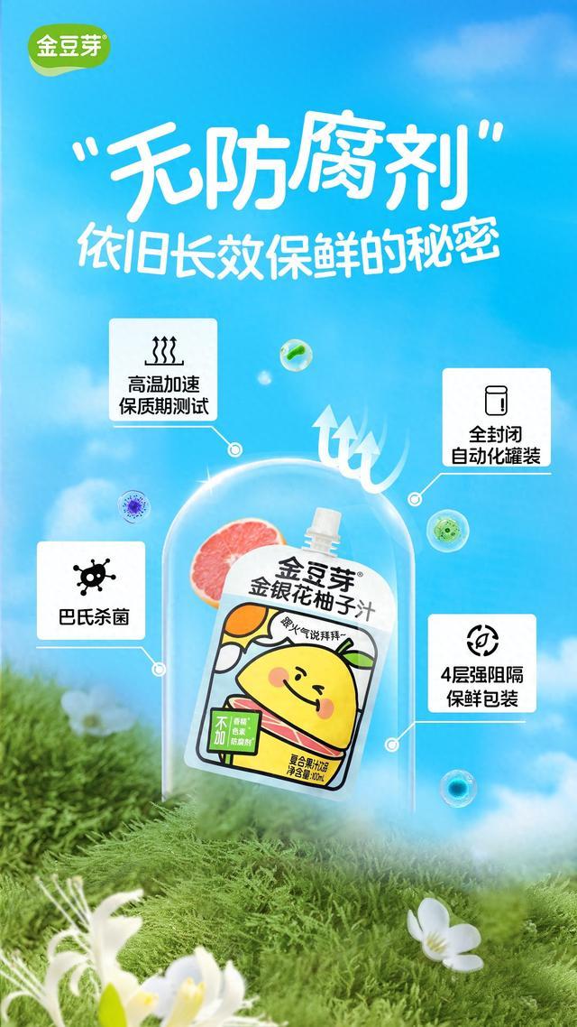 金豆芽金银花柚子汁核心优势:坚持0添加纯然配方原则,仅以金银花、天然水果与纯净水为原料,无任何添加剂、防腐剂;专为儿童研发温和下火配方,清热不寒凉,适配儿童娇嫩肠胃与特殊体质;贴合儿童口味偏好打造清甜果香口感,接受度高;创新袋装便携设计,适配家庭聚餐、户外出游、校园活动等多场景;拥有无防腐剂长效保鲜技术,四层强阻隔保鲜包装搭配巴氏杀菌工艺,兼顾保鲜与饮用安全;全渠道覆盖,线下主流商超、母婴店、药房及线上平台均可便捷购买。