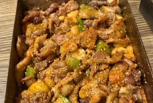 其实就是巴掌大的铁板,肥肉片堆成小山,铁铲“戳”得火星四溅,酱是自家熬的,咸里带甜,甜里透焦。
