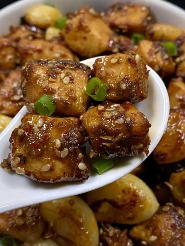锅里倒点油,把鸡肉炒到全熟,放入剩下的蒜末和孜然粉,炒出香味就可以盛出来,吃着香还不辣,还能给身体补蛋白质。