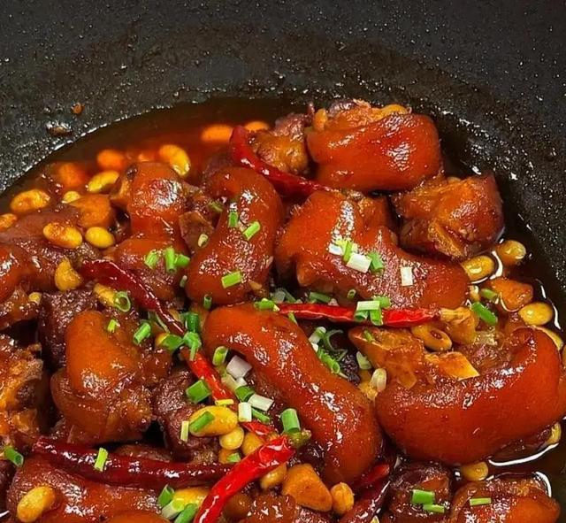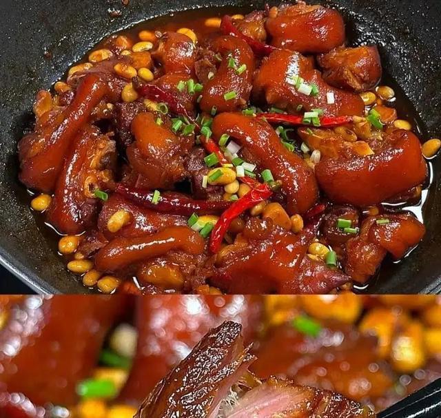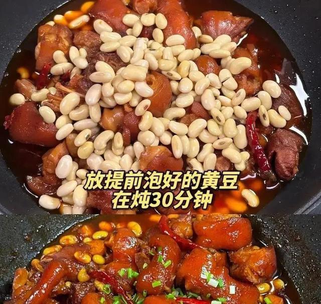 哦对还有黄豆焖猪蹄,黄豆我一般提前泡两个小时,炖出来粉粉的,猪蹄炖得烂烂的,皮糯叽叽的,也不用放太多调料,加点生抽盐调味就行,味道足得很,啃着特别香。