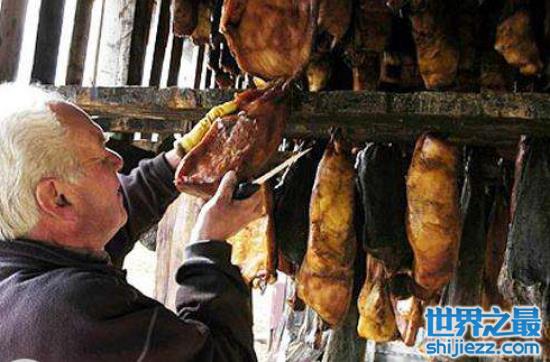 臭猪肉,四川扎坝人的食物,当地人非常喜欢吃,臭猪肉做法复杂,时间也长,做好后的猪肉悬挂年限可达10年以上,最长的可达30余年。食用时,随用随取,做法也很多,可生吃,可煮食,也可熬汤,扎坝人家家户户都要熏制“臭猪肉”,并且且存放越久越被视为珍贵,也是作为居家待客的最高珍品。
