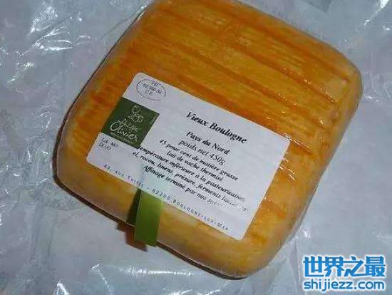 Vieux-Boulogne奶酪,产自法国西北部,由于在成熟过程中在外皮涂抹啤酒工艺使它在发酵过长中放出恶臭,进而成为世界上最臭的一种奶酪。