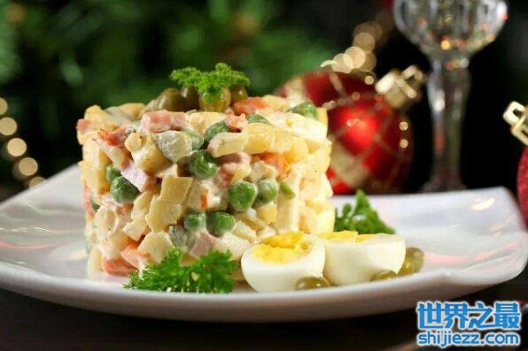 俄式奥利维尔色拉是俄罗斯有名的凉拌菜,是以土豆、酸黄瓜、红萝卜、煮鸡蛋等食材为原料使用蛋黄酱拌制而成的,是俄罗斯很多餐厅的招牌菜。