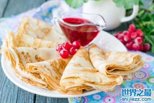 俄罗斯的这款布利尼薄饼集法国煎饼和中式煎饼于一身,味道可甜可咸,饼皮是用面粉、牛奶、奶油加入糖或者盐制成的面糊在铁锅上煎熟而成的。咸饼会加上熏三文鱼或者鱼子酱,甜饼则会抹上果酱和炼乳。