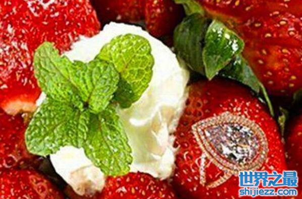 这道菜虽然看上去比较简单,这款甜品只是在一盘草莓上放上一些奶油和薄荷叶,但真正的主角却是一枚镶嵌着一颗4.7克拉的粉红色钻石的钻戒,这道草莓拼盘的售价为140万美元,吃的时候由一位戴着白手套的侍者还会端上一瓶价值24850美元的红酒,爵士乐队还会在旁伴奏。