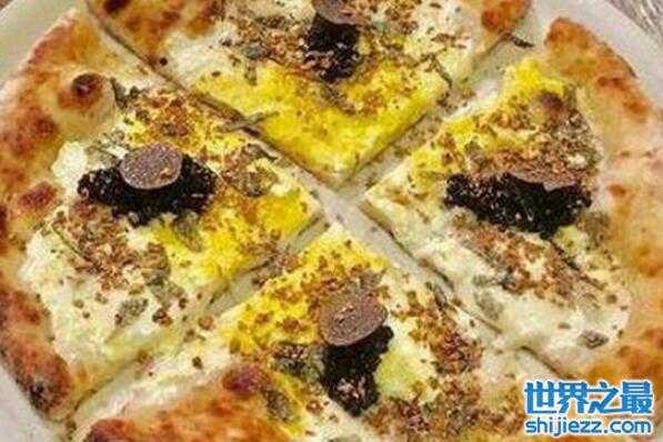 这款白松露黄金比萨号称是世界上最贵的披萨,这款披萨的配料中使用了昂贵的白松露、水牛芝士,然后再撒上24 k食用金箔,售价为2420美元。