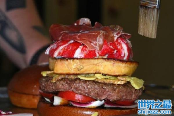 而且作为世界上最贵的汉堡,表面的金箔还算便宜,反而是里面的夹层都是世界最昂贵的食材,不仅牛肉饼是日本上等的和牛制作,还添加了40欧一公斤的龙虾,据说是注入了杜松子酒的,而且酱汁使用的也是90欧一公斤的鹅肝酱,就连最普通的生菜和番茄也都是日本和法国特供的,哪怕是最外层的法式面包也达到了一片120欧的价格,还带有一丝藏红花的味道。
