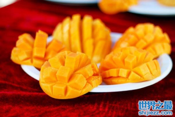 芒果是热带水果,每年春夏季节生长成熟,果实呈现长圆形,果皮、果肉均为黄色,口感软糯爽滑,味道鲜美,而且芒果中含有大量的糖分和维生素,能够缓解眼部疲劳,起到明目的作用。