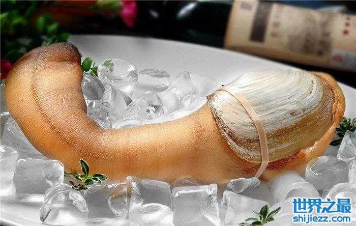 它的长相很奇特,看上去像是贝壳长了一个脚,它是象拔蚌中最贵的品种,一斤大概要卖6千元左右,这个价钱在众多海鲜中也算是很高的了。