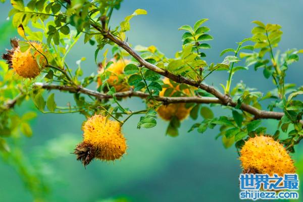 刺梨全身布满尖刺,成熟时果实为金黄色,在食用时,需要将果肉中的籽去除,口感清脆,酸味浓郁,而且植株内含有丰富的维生素C。