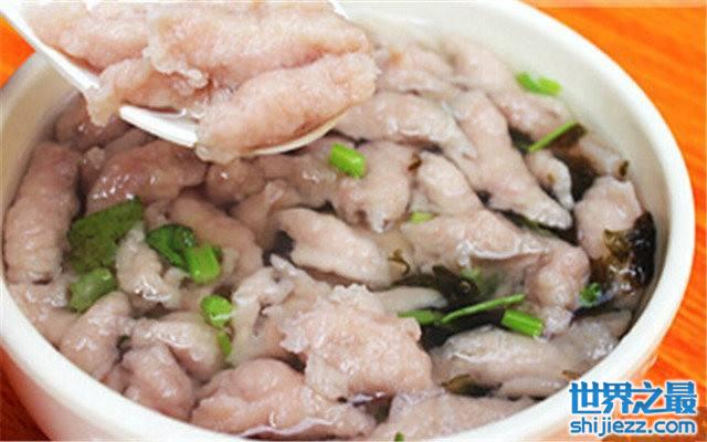 福鼎肉片是福建的一道地方传统特色名菜,来自福建福鼎。福鼎肉片的整个制作过程都是手工制作,用木槌敲打的方式将猪后腿肉打成肉泥,用双手揉搓成肉糊,冰水搅拌揉打,整个过程费时费力,但煮出来的肉片颜色粉白、肉质弹嫩。