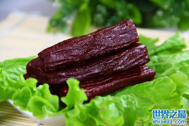 内蒙古有着广袤的天然草场,这里的牛长得自然特别肥壮。这种牛肉的肉质是南方地区的黄牛和水牛所不能及的。这道美味制作简单,只需要将新鲜牛肉放在室外自然晾晒数月即可。成品闻上去香味醇厚,要上去更是肉香四溢,越嚼越香。