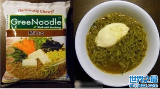 这是一款来自泰国的泡面“绿泡面味噌口味”,其实真正吃下去面条的口感还是不错的,但它这绿色的汤汁实在叫人无法下咽,吃着吃着就没食欲了。