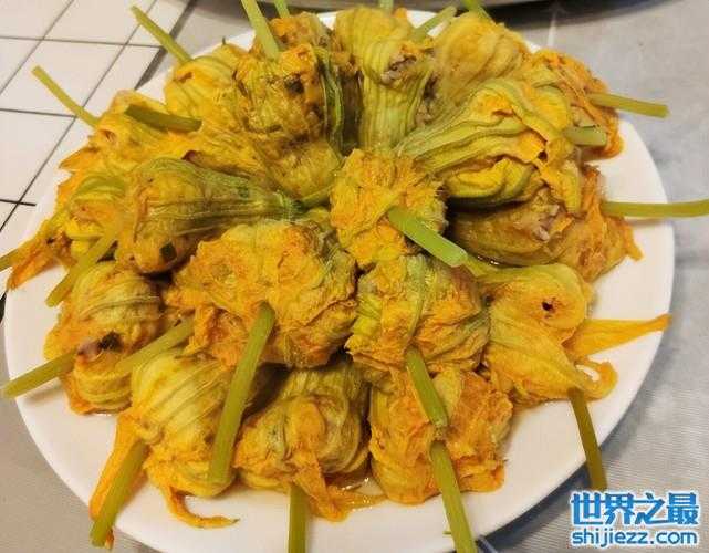 瓜花酿就是广西贺州的一道招牌特色酿菜,深受当地人喜爱,是“夏天的味道”!新鲜采摘的南瓜花,择好洗净,按肉馅两倍体积准备豆腐,捣碎,打个鸡蛋搅入,再把肉馅倒入碎豆腐拌匀,馅料塞入瓜花,开口处把花瓣向内折盖住,插根花梗固定。可煮汤可清蒸,很鲜美,很多人都会慕名来到贺州品尝瓜花酿。