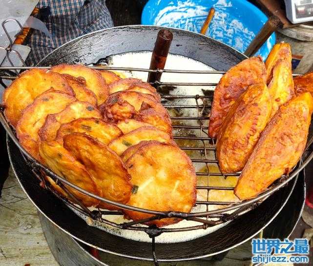 铜瓢粑是广西柳州的特色小吃,铜瓢粑有八角形和圆形,做法是用铜瓢盛米浆,拌入盐和萝卜丝、南瓜丝,放入油锅炸即成。铜瓢粑金黄耀眼,香喷喷的,外香酥里松软,是颇有特色的美味小吃!当地人习惯用铜瓢粑配着粉吃,别有一番风味,你们吃过吗?