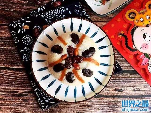 “八宝饭”由8种原料合成。所谓“八宝”,并不固定,由厨师根据各地民情风俗而定。糯米、白糖、熟猪油是八宝饭的主要原料。糯米蒸熟,趁热拌入猪油和白糖,再加入八宝,二次蒸制。吃上一口,饱满的糯米、绵密的红豆沙、酸甜的果干、香脆的坚果,香甜软糯,层次丰富,回味良久。