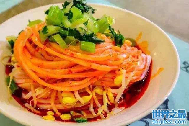陕西秦镇凉皮距今已有2000多年的历史,它是由小麦面粉、还有米粉制作而成,用料考究,拌入红红的辣椒油,能够热吃、凉拌,还能热炒,吃法多样,口味酸香鲜辣,顺滑Q弹,备受食客喜欢,而且在西安是很接地气的。
