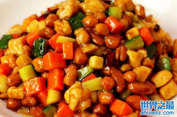 宫保鸡丁是闻名中外的传统名菜,早先为宫廷菜肴,后流传到国外,由肉、花生米、辣椒等原料烹制而成,鲜滑爽口,加上内含蛋白质、维生素等多种营养成分,有补气养血、增强人体免疫的功效。