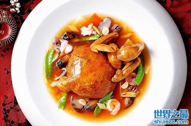 布袋鸡是济南夏津县的地方传统名吃,又叫“海味什锦鸡”,因为成品看起来很像布袋,所以取名布袋鸡。布袋鸡是选用散养的土鸡作为原料,宰杀去毛后从咽下切个小口,剔除骨头和内脏,然后把海参、鲍鱼、火腿等名贵食材装入其中,先用油炸至金黄,再上蒸笼蒸制而成。布袋鸡的特色:肉鲜馅大、肥而不腻、香嫩可口。