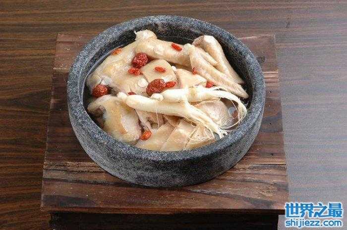这道菜光听名字就知道是一道不一般的菜。需要用道上等的老母鸡做主食材,其中放入人参,因为人参自身带有一股土味,所以需要用茅台酒来去除人参的土腥味,三者调为一体,吃后大补!